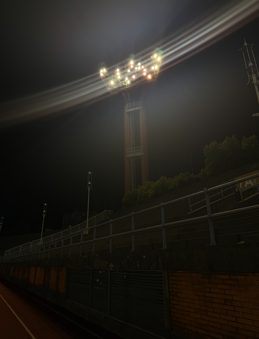 在跑道上看灯光有些晃眼。