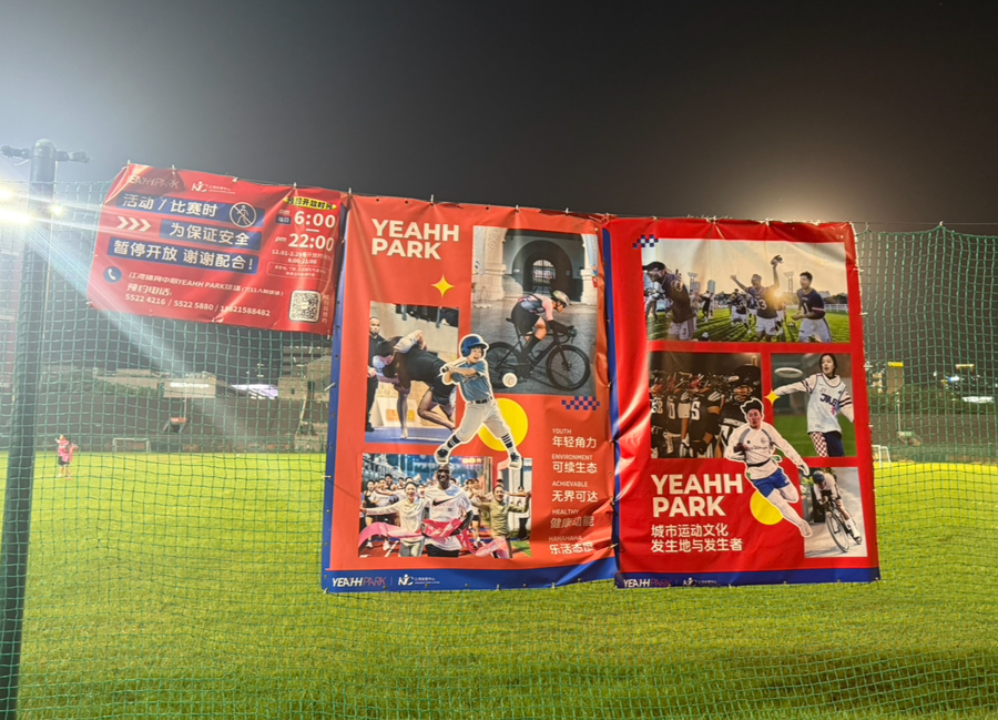 此时,足球场跑道对市民开放,不少市民正在跑步或散步。足球场草坪则设置了高高的围挡,围挡上的广告牌显示,足球场内部作为“YEAHH PARK”活动场地,内部有体育活动正在进行。记者尝试加入跑步市民,发现在跑道外圈灯光也较为刺眼,几乎只能低头跑步或散步,一旦抬头很容易被强光晃眼。